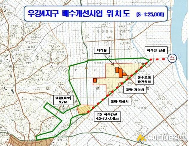 사업은 총 93ha 규모의 농경지를 대상으로, ▲배수장 1개소 설치 ▲배수로(3.40km) 정비 ▲교량 2개소 개선 ▲매립(9.7ha) 등을 추진할 예정이다.
