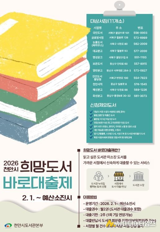 천안시도서관본부는 내달부터 ‘희망도서 바로대출제’ 서비스를 운영한다고 30일 밝혔다.