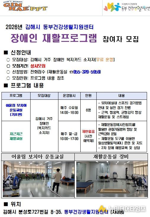 참여를 원하는 김해시 거주 장애인(복지카드 소지자)은 동부건강생활지원센터에 방문 또는 전화로 접수 가능하다.