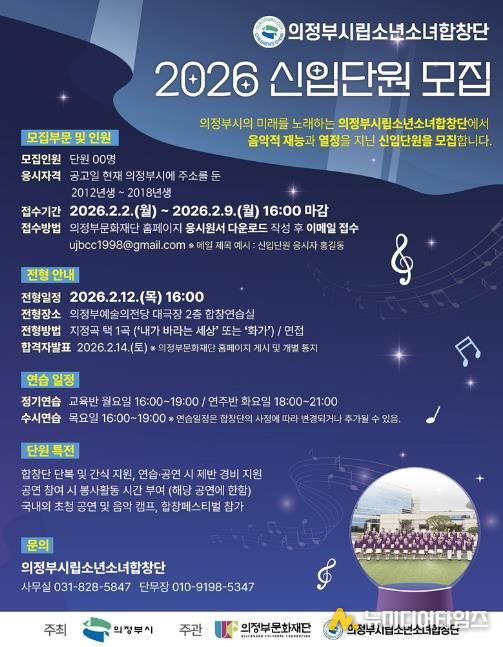전형은 2월 12일 의정부예술의전당 2층 연습실에서 실시되며, 응시자는 지정곡인 ‘내가 바라는 세상’과 ‘화가’ 중 1곡을 선택해 가창하면 된다. 최종 합격자는 2월 14일 의정부문화재단 누리집과 개별 통지를 통해 발표할 예정이다.