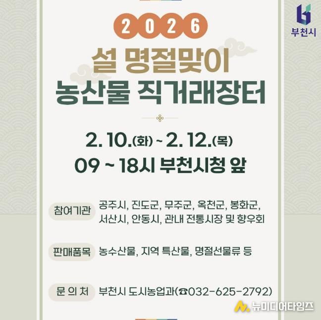 부천시는 설 명절을 앞두고 2월 10일부터 12일까지 시청 정문 앞에서 ‘2026년 설 명절맞이 농산물 직거래장터’를 연다.