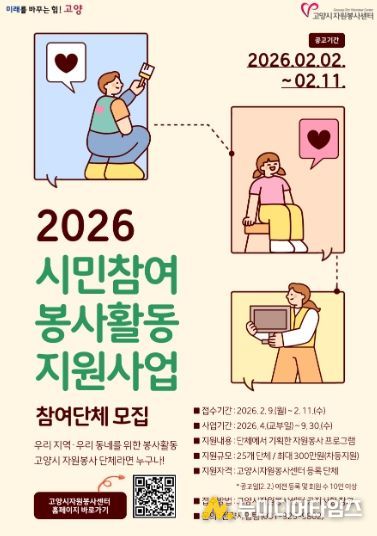 고양시자원봉사센터는 ‘2026 시민참여 봉사활동 지원사업’에 참여할 자원봉사 단체를 모집한다고 2일 밝혔다.