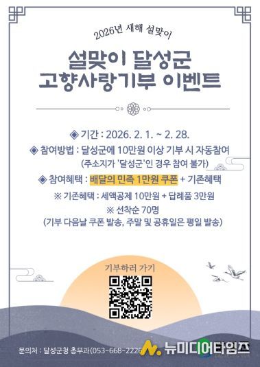 달성군은 2026년 첫 명절을 앞두고 고향사랑기부제 참여를 늘리고 기부 문화를 확산하기 위해 2월 1일부터 28일까지 이벤트를 마련했다. 기간 중 달성군에 10만 원 이상 기부하면 자동으로 응모되며, 선착순 70명에게 1만 원 상당의 배달 상품권을 지급한다. 상품권은 기부 다음 날 제공되며, 주말이나 공휴일인 경우 다음 평일에 지급된다.