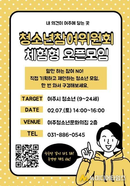 모집 대상은 여주시에 거주하거나 재학 중인 9세~24세 청소년이며, 모집 기간은 2월 18일까지이다. 선발된 위원들은 월 1회 정기회의 및 분과활동을 비롯해 정책 제안, 행사 기획, 청소년 사업 모니터링, 다른 지역 청소년참여위원회와의 교류 활동 등에 참여하게 된다.