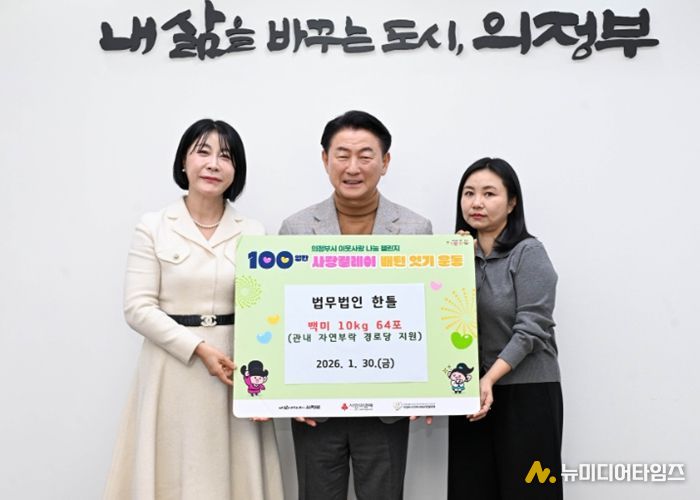 의정부시는 1월 30일 법무법인 한틀이 관내 자연부락 경로당에 총 220만 원 상당의 백미 64포(10kg 단위)를 기탁하며 ‘100일간 사랑릴레이 배턴 잇기’에 동참했다고 밝혔다.