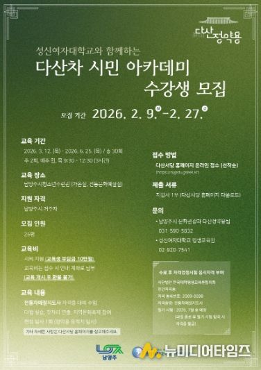 모집 인원은 총 25명으로, 남양주시 평생학습포털 ‘다산서당’을 통해 선착순으로 접수받는다. 교육비는 총 60만 원 상당이나 시의 교육 지원을 통해 10만 원의 자부담만으로 참여할 수 있다. 남양주시 거주 고등학교 졸업자 이상 시민이면 누구나 신청 가능하다.