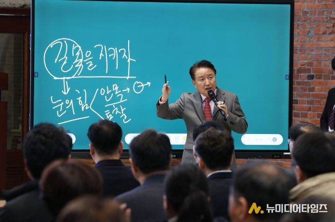 김 지사는 ‘길목을 지키자’라는 주제의 발언을 통해 “안목은 중요한 것을 가려내는 눈이고, 통찰은 본질을 꿰뚫는 힘”이라며, “민선8기 충북은 백두대간에 막히고 바다가 없다는 지리적 한계를 오히려 ‘대한민국의 길목’이라는 기회로 재해석해 왔다”고 서두를 뗐다.