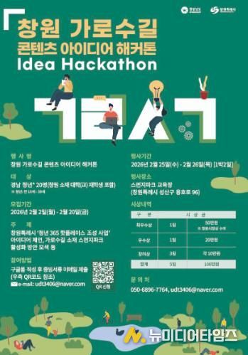 창원특례시는 ‘청년 365 핫플레이스 조성 사업’의 일환으로 2026년 2월 25일부터 26일까지 이틀간 스펀지파크 교육장(창원시 성산구 용호로 96)에서 '창원 가로수길 콘텐츠 아이디어 해커톤' 을 개최한다고 밝혔다.