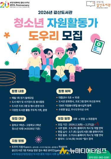 부평구립 갈산도서관은 오는 27일까지 청소년 자원활동가 ‘도우리’를 모집한다고 밝혔다.