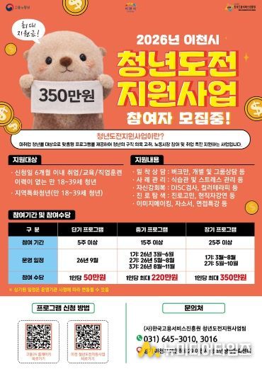 참여를 희망하는 청년은 고용24 누리집을 통해 신청할 수 있으며 모집기간은 2월 4일부터 모집인원 마감 시까지 선착순으로 진행된다. 자세한 문의는 이천시 청년도전지원사업 운영사무실로 하면 된다.