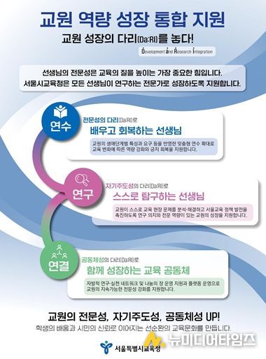 ‘교원 성장의 다리(Da:RI, Development and Research Integration)’는 연수(배우고 회복하는 선생님), 연구(스스로 탐구하는 선생님), 연결(함께 성장하는 교육공동체)의 통합 지원 체계 구축을 상징하며, 서울교육의 현재와 미래를 연결하는 다리(Bridge)를 의미한다. 구체적인 내용은 다음과 같다.