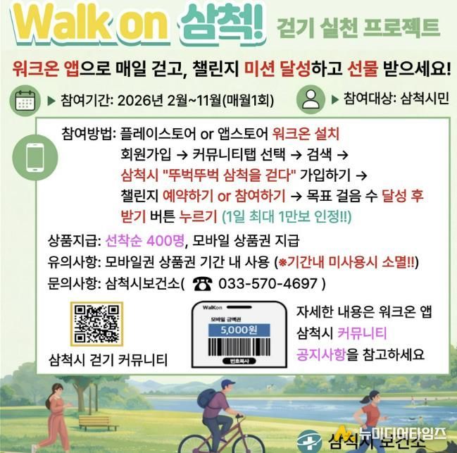 삼척시는 시민들의 건강 증진과 일상 속 걷기 실천율 향상을 위해 모바일 걷기 앱 '워크온(Walk On)'을 활용한 ‘워크온 걷기 챌린지’를 오는 2월부터 11월까지 운영한다.