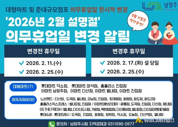 남양주시는 설 명절을 맞아 관내 대형마트와 일부 준대규모점포(SSM)의 의무휴업일을 기존 2월 11일(수)에서 설 당일인 17일(화)로 한시적 변경 운영한다고 5일 밝혔다.