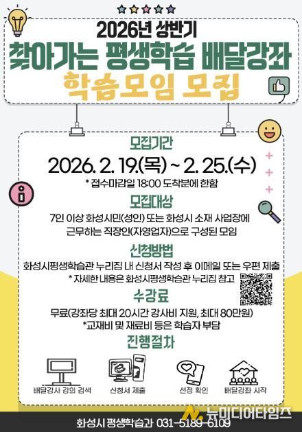 화성특례시는 2월 19일부터 2월 25일까지 2026년 상반기'찾아가는 평생학습 배달강좌'학습모임을 모집한다.
