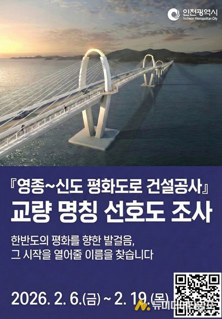인천광역시는 오는 5월 개통을 앞둔 ‘영종~신도 평화도로’ 교량의 명칭을 제정하기 위해 2월 6일부터 시민 선호도 조사를 실시한다고 밝혔다.