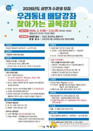 기장군은 오는 2월 9일부터 12일까지 ‘상반기 우리동네 배달강좌 및 찾아가는 골목강좌’ 수강생을 모집한다고 6일 밝혔다.