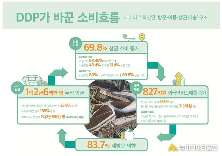 실제로 DDP가 위치한 동대문역사문화공원역(2‧5호선) 승하차 인원이 몇 년새 뚜렷하게 증가했으며, 네비게이션 목적지 검색건수도 늘었다. 또한 DDP 방문객 10명 중 7명(69.8%)은 주변 상권을 이용했다고 답해 DDP가 지역 상권 소비 매개로 자리잡았다는 것이 데이터로 확인되고 있다. 특히 외국인들이 만족하는 서울 대표 명소로 꼽히며 외국인의 인근 상권 지출이 2년새 6.5배나 증가했다.
