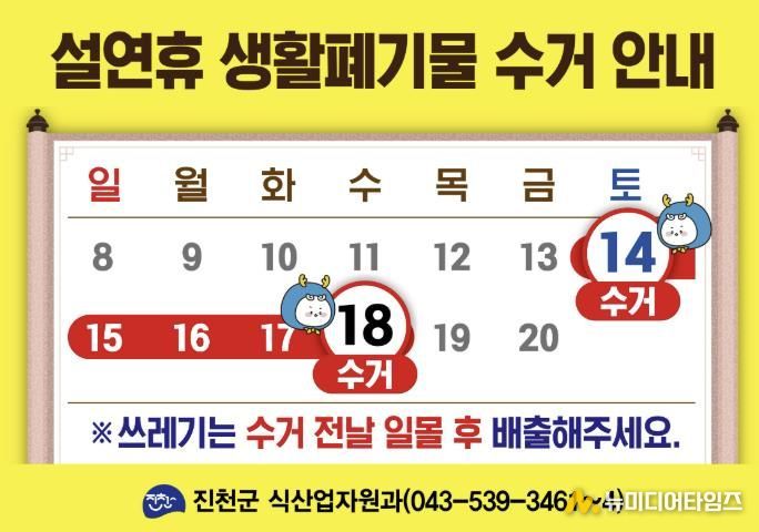 또한 군은 연휴 기간 발생할 수 있는 불편에 대비해 14일부터 18일까지 ‘생활 쓰레기 상황반’을 운영할 방침이다.