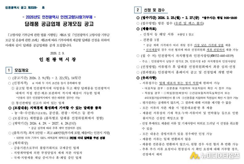 인천광역시는 고향사랑 기부문화 확산과 지역경제 활성화를 이끌 답례품 발굴을 위해 2월 9일부터 '2026년 인천사랑기부제 답례품 공급업체'를 공개 모집한다고 밝혔다.