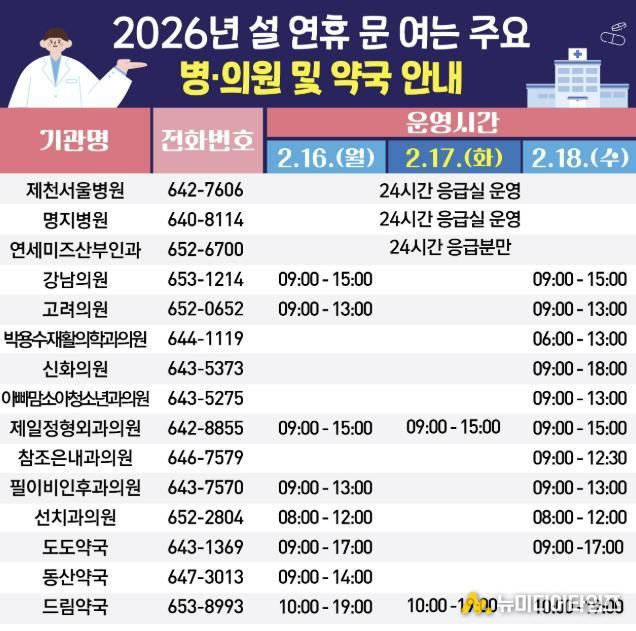 먼저 24시간 응급실을 운영하는 명지병원과 제천서울병원 등 응급의료기관 2개소를 핵심 거점으로 지정해 중증 환자 발생에 대비한다. 이와 함께 경증 환자가 가까운 곳에서 신속히 진료받을 수 있도록 병의원 109개소와 약국 52개소를 일자별로 지정 운영해 의료 공백을 최소화할 계획이다.
