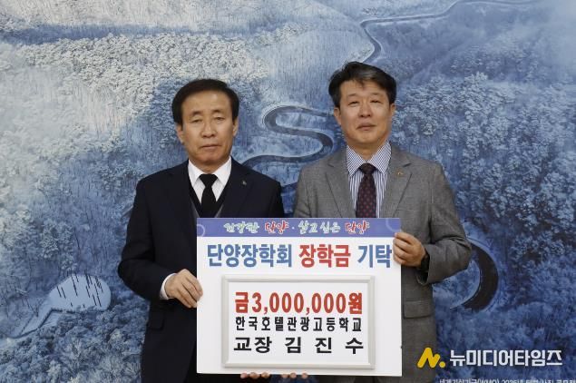 단양장학회는 지난 9일, 한국호텔관광고등학교 김진수 교장이 군수실에서 장학금 300만 원을 기탁했다고 밝혔다.