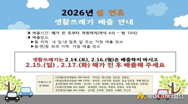 쓰레기 수거 문의는 휴무일인 2월 15일과 17일을 제외하고, 오전 6시부터 오후 3시까지 생활쓰레기 배출안내문 상 업체를 통해 확인할 수 있다.