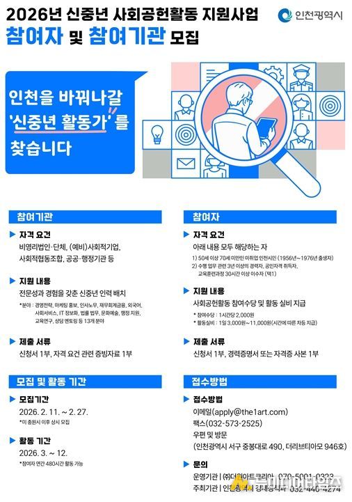 인천시는 이달 11일부터 27일까지‘신중년 사회공헌활동 지원사업’에 참가할 기관과 참여자를 모집한다고 밝혔다.