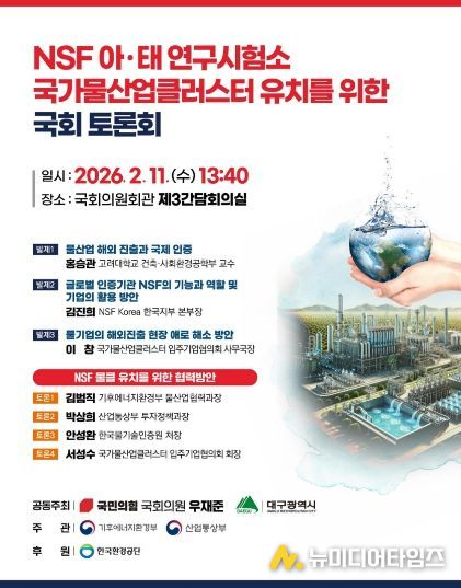 이를 위해 대구시는 2월 11일 국회의원회관에서 ‘NSF 아·태 연구시험소 국가물산업클러스터 유치를 위한 국회 토론회’를 개최하고, 글로벌 물기술 인증 경쟁력 강화를 위한 공론화에 나선다.