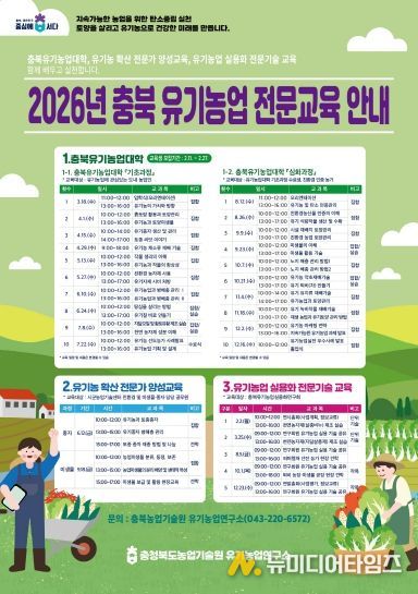 충북농업기술원은 유기농업 전문인력양성을 위해 ‘2026년 충북유기농업대학’ 교육생을 2월 11일부터 27일까지 모집한다. 모집 대상은 충북 지역에 거주하며 유기농업 실천을 희망하는 농업인으로, 기초과정과 심화과정에서 각각 50명을 선발할 계획이다.