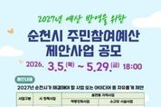 순천시는 2027년도 예산편성 과정에 시민의 다양한 의견과 아이디어를 반영하기 위해 3월부터 5월까지 주민참여예산 제안사업을 접수한다고 밝혔다. 주민참여예산제는 시민이 직접 지역에 필요한 사업을 제안하고, 이를 예산에 반영함으로써 재정 운영의 투명성과 민주성을 높이는 제도이다. 시민의 시각에서 생활 속 불편사항을 발굴하고, 지역 현안 해결을 위한 정책을 제안할 수 있다는 점에서 실질적인 참여 행정의 대표제도로 자리매김하고 있다. 순천시는 2021년부터 24개 읍면동 주민자치회를 전면 시행해 왔으며, 주민참여예산제를 통해 생활밀착형 사업과 지역 현안 사업을 지속적으로 발굴·추진해 왔다. 그 결과 소규모 생활환경 개선, 지역특화사업, 지역돌봄 및 역량강화 사업 등 시민 체감도가 높은 사업들이 다수 반영됐다. 이번 공모는 순천시에 주소를 두거나 생활권을 두고 있는 시민 누구나 참여 가능하며, ▲생활 불편해소 ▲지역 공동체 활성화 ▲돌봄․안전·환경 개선 등 시민의 일상과 밀접한 다양한 분야의 사업을 자유롭게 제안할 수 있다. 접수된 사업은 관련 부서의 검토와 주민참여예산위원회 심의