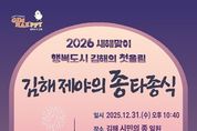 김해시는 ‘2025 김해 제야의 종 타종식’을 오는 31일 오후 10시40분부터 2026년 1월 1일 0시 30분까지 김해시민의 종 일원에서 개최한다고 26일 밝혔다. 기존 의례 중심의 타종에서 벗어나 시민 참여와 지역성을 핵심 가치로 한 체험형·참여형 새해맞이 행사로 새롭게 구성한 것이 특징이다. 특히 타종인사 상당수를 공모로 선정한 30명의 시민대표로 구성해 새해의 첫 울림을 시민 스스로 만들어 가는 의미 있는 행사로 마련했다. 시민들은 타종뿐 아니라 시민 송년사 영상, 새해소망 메시지 참여 등으로 행사 전반에 직접 참여한다. 공연 프로그램도 김해의 정체성을 살린 지역 예술인 중심 무대로 꾸며진다. 우리소리예술단의 전통공연을 시작으로 전자바이올린, 혼성그룹 공연이 어우러진 제야음악회를 비롯해 시립합창단의 수준 높은 공연과 농악 피날레 공연으로 새해의 흥을 더할 예정이다. 또 공연장 곳곳에서 남녀노소 누구나 즐길 수 있는 체험형 부대행사가 운영된다. 새해 소망을 적어 거는 소망지, 1년 뒤 전달되는 느린 우체통, 전통놀이 체험존, 포토존 등은 가족 단위 방문객