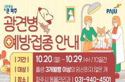 파주시는 반려견을 동반한 야외활동이 잦아지는 가을을 맞아 오는 20일부터 29일까지 생후 3개월 이상의 임신하지 않은 개를 대상으로 광견병 예방접종을 실시한다고 밝혔다. 광견병은 바이러스에 의해 사람과 동물 모두에게 감염될 수 있는 인수공통전염병으로, 잠복기가 상당히 길고 증세가 나타날 경우 치사율이 매우 높기 때문에 사람과 반려동물 모두를 위해 반려견은 매년 1회 반드시 예방접종할 것을 적극 권장하고 있다. 시는 하반기 광견병 예방사업을 위해 예방백신 4,500마리 분을 무상 지원하며, 예방접종을 희망하는 반려견 보호자는 33개 지정 동물병원을 방문해 시술비 1만 원만 부담하면 접종이 가능하다. 참여 동물병원 목록은 파주시청 누리집 공고문을 통해 확인할 수 있다. 동물병원이 없는 읍면지역은 시에서 직접 수의사를 파견해 순회접종을 진행하며, 이 경우 접종비 전액을 시에서 지원할 방침이다. 읍면지역 순회접종 일정은 해당 읍면 행정복지센터 산업팀에 문의하면 된다. 아울러 파주시는 야생동물의 광견병 전파를 막기 위해 광견병 미끼백신을 너구리 등 야생동물이 자주 출몰하는 관내 야산에 살포하는 사업도 지속