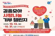 군포시 산본보건지소는 오는 10월 13일부터 31일까지(19일간) 국민건강보험공단 군포지사와 함께하는 '걸음모아 사랑나눔' 기부챌린지를 운영한다. ‘걸음모아 사랑나눔’ 기부챌린지는 2023년부터 군포시와 국민건강보험공단 군포지사가 협력해 추진해 온 사회공헌형 걷기 사업이다. 시민들이 일상 속에서 걸음을 모아 목표를 달성하면 이를 기부로 연계해 취약계층에 전달하는 방식으로 진행되며 시민과 지역 내 기업·단체가 함께 참여해 건강한 나눔 문화를 지역사회에 확산시키고 있다. 기부챌린지는 군포시민 누구나 참여할 수 있으며 참여 기간은 10월 13일부터 31일까지이다. 참여방법은 워크온 앱을 설치한 뒤 ‘군포시 공식 커뮤니티’에 가입해 챌린지에 참여하면 된다. 챌린지 기간 동안 누적 목표 걸음 수 1억 5천만보를 달성하면 국민건강보험공단 군포지사에서 기부하는 총 100만 원의 기부금이 관내 아동복지시설과 지역아동센터 2곳에 전달될 예정이다. 김미경 군포시 보건소장은 “이번 챌린지는 단순히 건강을 위한 걷기를 넘어 시민 한 분 한 분의 발걸음이 모여 취약계층을 돕는 소중한 나눔으로 이어진다는 데 큰 의미가 있다”며 “앞으로