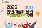 (재)천안문화재단은 오는 19~ 30일 천안시립미술관 문화자원봉사자를 모집한다고 14일 밝혔다. 문화자원봉사자로 선발되면 오는 3월부터 내년 2월까지 관람 안내, 전시·교육·행사 지원 등의 활동을 하게 되며, 봉사실적 인정, 기초·전문 교육, 소정의 활동비 지급 등의 혜택이 제공된다. 모집 대상은 문화예술에 관심이 있는 20세 이상 성인으로, 1차 서류 심사와 2차 인터뷰 심사 등을 통해 내달 30명 내외를 선발할 예정이다. 지원 신청은 천안시립미술관 누리집에 게재된 공고문을 확인한 후 신청서 양식을 내려받아 담당자 이메일로 접수하면 된다. 자세한 사항은 천안시립미술관 누리집을 참고하거나 시각예술팀으로 문의하면 된다.