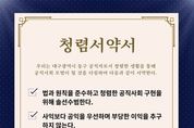 대구 동구청은 청렴 문화 확산과 공직기강 확립을 위해 청렴한 생활을 통해 모범이 될 것을 다짐하는 ‘청렴서약서’를 제작해 구청 부서 및 동행정복지센터 출입구에 부착했다. 서약서에는 △법과 원칙 준수 △공익 우선 △금품·향응 수수 금지 △공정하고 객관적인 직무 수행 등의 내용이 담겼다. 김태운 동구청장 권한대행은 “청렴은 선택이 아닌 공직자가 갖춰야 할 가장 중요한 가치”라며 “전 직원이 책임감을 느끼고 구민들에게 신뢰받는 투명한 행정을 펼쳐 나가겠다”고 말했다. [뉴스출처 : 대구시동구청]