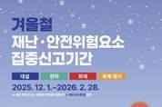 청양군은 겨울철 재난과 안전사고 예방을 위해 지난 1일부터 오는 2026년 2월 28일까지 약 3개월간 ‘겨울철 재난·안전 위험요인 집중신고기간’을 운영한다고 밝혔다. ‘안전신문고’는 국민 누구나 생활 주변의 각종 재난·안전 위험요인을 사진 또는 동영상으로 촬영해 신고할 수 있는 온라인 신고 시스템으로, 홈페이지와 모바일 앱을 통해 간편하게 이용할 수 있다. 이번 집중신고 기간은 겨울철에 특히 많이 발생하는 재난·안전사고를 사전에 예방하기 위해 마련된 것으로, 주요 신고 유형은 ▲대설 ▲한파 ▲화재 ▲축제·행사 등 4개 분야다. 대설 분야에서는 ▲도로 제설 미흡 ▲제설함 관리 불량 ▲시설물 붕괴 위험 등을, 한파 분야에서는 ▲인도 결빙 ▲고드름 낙하 ▲한파 쉼터 불편 사항을 신고할 수 있다. 또한 화재 위험과 관련해 ▲비상구 물건 적치 ▲담배꽁초 투기 ▲소화시설 불량 ▲불법 취사·소각 등을, 축제·행사 분야에서는 ▲인파 밀집 우려 ▲행사장 시설 파손 등을 신고 대상으로 하고 있다. 신고는 안전신문고 앱 또는 홈페이지에서 ‘겨울철 집중 신고’ 메뉴를 선택해 간편하게 진행할 수 있으며, 신