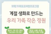 인천광역시교육청연수도서관은 오는 10월 25일 오후 2시 평생학습1실에서 가족 이용자를 위한 ‘10월 가족 토요체험 프로그램’을 운영한다. 이번 프로그램은 ‘우리 가족 마음 정원’을 주제로 가을의 정취를 담은 그림책을 함께 읽으며 가족의 마음을 돌아보고 함께 소통하는 시간을 갖는다. 이어지는 원예 활동에서는 계절 생화를 활용해 가족의 작은 정원을 만들며 자연과 감성을 나눌 예정이다. 참여 신청은 10월 13일부터 연수도서관 누리집에서 선착순 접수하며, 자세한 내용은 연수도서관 독서문화과 로 문의하면 된다.