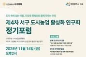 인천 서구의회 《서구 도시농업 활성화 연구회》는 14일 오후 2시, 서구청 대회의장에서 제4차 정기포럼을 개최한다. 이번 정기포럼 주제는‘도시 속에 심는 마음, 치유와 회복으로 함께 자라는 우리’로 발제는 서울대학교 이성우 책임연구원이 맡는다. 그동안 연구단체는 치유와 힐링의 도시농업 연구에 따른 자연친화, 환경회복 도시환경 조성을 주제로 연구 활동을 지속해 왔다. 전국 우수사례 현장 견학 13회와 정책 연구용역 2건을 진행했고, 포럼과 세미나를 3차례 개최했다. 이번 보고회는 그간의 왕성한 활동을 통해 얻어진 연구 성과의 최종 발표로 도시농업에 관심이 많은 구민들의 기대를 모으고 있다. 특히 이번 행사는 부대 프로그램도 함께 열려 더욱 풍성하다. ‘도시농업으로 만드는 치유와 회복의 여정’ 연구활동 성과와 참여 기관의 치유농업 성공 사례 성과물도 함께 전시한다. 이번 정기포럼에 대해 김남원 대표 의원은 “3년 동안의 단일 주제로 연구 활동을 해왔다”, “2023년 처음 활동 당시 의원님 그대로 열과 성의를 다해 동참해 주신 결과의 산물이다”라며“사례 수집을 위해