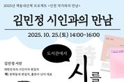 인천광역시교육청계양도서관은 10월 25일 오후 2시 ‘책동네산책 프로젝트’의 일환으로 ‘김민정 시인과의 만남’을 개최한다. ‘도서관에서 시를 줍다’를 주제로 열리는 이번 프로그램에서 김민정 시인은 작품 세계와 시에 관한 다양한 이야기를 독자들과 나누며 문학적 공감을 형성할 예정이다. 김민정 시인은 1999년 『문예중앙』으로 등단해 시집 《날으는 고슴도치 아가씨》, 《아름답고 쓸모없기를》, 산문집 《각설하고,》, 《읽을, 거리》 등을 펴냈으며, 출판사 난다 대표와 ‘문학동네 시인선’ 편집자로서 활발한 활동을 이어오고 있다. 참여 신청은 10월 1일 오전 10시부터 계양도서관 누리집에서 선착순 가능하며, 자세한 사항은 누리집 공지사항을 확인하거나 독서문화과로 문의하면 된다.