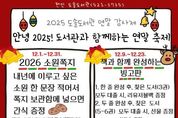 천안시 도솔도서관은 12월 한 달간 ‘도솔도서관 연말 감사제’를 운영한다고 3일 밝혔다. 도솔도서관은 시민들에게 감사한 마음을 전하기 위해 ‘안녕 2025! 도서관과 함께하는 연말 축제’를 열고 다채로운 문화 프로그램을 선보인다. 프로그램은 ▲새해로 보내는 메시지-2026 소원 쪽지 ▲도솔, 언제 태어났게? 개관 연도 퀴즈 ▲책과 함께 완성하는 빙고판 ▲달성하라! 2단계 종이접기 미션 ▲크리스마스 선물 원화 전시로, 시민 누구나 자유롭게 참여할 수 있다. 도서관 관계자는 “연말 감사제를 통해 시민들이 도서관에서 따뜻한 시간을 보내길 바란다”며 “누구나 부담없이 참여할 수 있는 프로그램인 만큼 많은 참여 바란다”고 말했다.