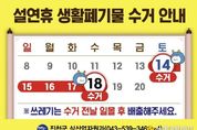 충북 진천군은 설 연휴 동안 관내 생활 쓰레기 수거 일정을 일부 조정하고 생활폐기물 관리 종합대책을 마련했다고 9일 밝혔다. 이번 조치는 군민들이 명절을 더욱 쾌적하게 보내고, 민원 문의 발생 시 신속하게 대응하기 위해 마련됐다. 명절 연휴 기간 중 14일은 오전에만 쓰레기를 수거하며, 연휴 마지막 날인 18일은 정상적으로 수거한다. 또한 군은 연휴 기간 발생할 수 있는 불편에 대비해 14일부터 18일까지 ‘생활 쓰레기 상황반’을 운영할 방침이다. 최지혜 군 환경과 주무관은 “각 가정에서는 반드시 수거일 전날 저녁에 생활 쓰레기를 배출해 주시기 바란다”며 “이번 명절 연휴 기간 군민들의 불편이 없도록 최선을 다하겠다”고 말했다.