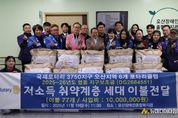 오산장애인종합복지관은 지난 19일 국제로타리 3750지구 오산지역 6개 로타리클럽의 합동 지구보조금 사업을 통해 1,000만 원 상당의 겨울 이불을 후원받아 복지관 세탁지원서비스를 이용하고 있는 장애인 가정에 전달했다고 밝혔다. 이날 전달식에는 국제로타리 3750지구 오산지역 6개 로타리클럽과 오산시자원봉사센터 등 지역 내 관계기관이 함께 참여했다. 후원품은 오산시에 거주하며 세탁지원서비스를 이용하는 장애인 가정 77가구에 전달됐다. 특히 로타리클럽 회원들은 후원품을 단순히 전달하는 데 그치지 않고, 각 가정을 직접 방문해 겨울 이불을 전달하며 안부를 묻고 따뜻한 마음을 나누는 뜻깊은 시간을 가졌다. 성도규 오산장애인종합복지관 관장은 “국제로타리 3750지구 오산지역 6개 로타리클럽의 따뜻한 관심과 후원 덕분에 장애인 가정이 보다 따뜻한 겨울을 보낼 수 있게 됐다”며 “앞으로도 지역사회와 함께 다양한 나눔 활동을 지속적으로 확대해 나가겠다”고 말했다. 오산장애인종합복지관은 앞으로도 장애인 가정의 건강한 일상과 복지 향상을 위해 다양한 지원과 나눔 활동을 이어갈 계획이다. 한편, 오산정란