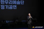 용인특례시는 5일 오후 수지구 용인평생학습관 큰어울마당에서 ‘한우리예술단 정기공연’이 열렸다고 6일 밝혔다. 용인특례시가 후원하고 용인민예총이 주최·주관한 이날 행사는 우리 고유의 가락과 춤을 한자리에서 만날 수 있는 전통 공연으로 꾸며졌고, 이상일 시장은 1시간 40분간 진행된 공연을 끝까지 지켜본 뒤 공연단을 격려했다. 공연은 농악, 민요, 가야금, 검무 등으로 우리 민족 고유의 소리와 정서, 삶의 이야기를 그려내 큰 박수갈채를 받았다. 할미성 농악 보존회는 꽹과리, 장구, 북, 징, 태평소 등의 악기를 활용해 역동적인 농악 판굿을 선보였다. 용인 아리랑 보존회는 청춘가, 태평가, 창부타령 등 흥겨운 경기민요를 열창하며 분위기를 이끌었다. 이어 검무가 남지연씨의 검무공연이 펼져졌다. 앙상블 더 가야금은 대중에게 친숙한 고향의 봄, 꽃타령, 까투리타령 등을 가야금 병창으로 들려주며 국악의 매력을 선사했다. 한우리예술단은 화려한 가락이 돋보이는 설장구로 타악의 진수를 보여줬다. 이상일 시장은 축사에서 “올해로 32회를 맞이한 한우리예술단 정기공연은