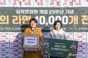 강북구의회 김명희 의장(번1·2동, 수유2·3동)은 지난 12월 2일, 강북문화예술회관 소나무홀에서 열린 강북문화원 개원 29주년 기념 ‘사랑의 라면트리’ 행사에 참석해 지역 이웃을 위한 나눔 활동에 함께했다. ‘사랑의 라면트리’ 행사는 강북문화원이 주민들로부터 받아온 관심과 성원을 어려운 이웃들에게 되돌리기 위해 마련한 사회공헌 행사로, 올해로 3회째를 맞았다. 한국마사회 지원사업으로도 선정되며 지역의 대표적 나눔 행사로 자리잡았다. 행사는 라면 전달식을 시작으로 설장구 식전공연, 유공자 표창, 문화공연 등 다양한 프로그램으로 채워졌다. 특히 올해는 강북미술협회가 20여 점의 작품을 기증해 ‘그림 기부전’을 함께 열며, 문화와 나눔을 결합한 새로운 형태의 기부가 주목을 받았다. 김명희 의장은 황정희 문화원장과 함께 라면 전달식에 참석해 정성을 모은 라면 1만 개를 어려운 이웃에게 전달할 준비를 마쳤으며, ‘2025 서울시 구의원 한마음 체육대회’에서 받은 ‘아차상’ 상금도 문화원에 기부해 뜻을 더했다. 김명희 의장은 “3년째 이어지는 ‘사랑의 라면트리’가 이제는 지역의 마음을 모으는 소중한 전통이