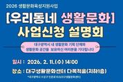 대구문화예술진흥원은 2월 13일부터 3월 6일까지 2026 생활문화육성지원사업 '우리동네 생활문화'에 참여할 생활문화 공간 및 연계 기획단체를 공개 모집한다. ‘우리동네 생활문화’는 지역 내 새로운 생활문화 공간을 발굴하고, 생활문화 기획 프로그램 운영을 통해 커뮤니티 기반 생활문화 공간 조성을 지원하는 사업이다. 올해는 대구 전 지역을 대상으로 신규 생활문화 공간 발굴과 함께 생활문화 활동이 부족한 권역(계층·지역)의 활성화 및 지속 가능한 공동체 육성에 중점을 두고 운영된다. 공모 대상은 대구에 소재한 생활문화 활동이 가능한 공간과 생활문화 기획 역량을 갖춘 단체(문화콘텐츠 관련 예술가·기획자·활동가 등으로 구성된 단체)가 연계된 단체가 대상이다. 올해는 총 10개 내외의 단체를 선정할 예정이며 선정된 단체에는 단체당 550만 원의 사업비 지원과 함께 ‘우리동네 생활문화 지도’ 플랫폼 내 통합 홍보 등을 지원할 예정이다. 공모에 앞서 2월 11일 14시, 대구생활문화센터에서 사업설명회가 진행되며, 사업 신청은 2월 13일부터 3월 6일까지 국가문화예술지원시스템을 통해 온라인으로 접