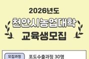 천안시농업기술센터는 내달 6일까지 ‘2026년도 천안시농업대학’ 교육생 30명을 모집한다고 23일 밝혔다. 천안시농업대학은 시의 농업을 선도할 신지식 농업인 양성을 목표로 운영되고 있으며, 현재까지 18기 35개 과정을 통해 1,139명의 졸업생을 배출했다. 올해는 포도 수출 확대와 경쟁력 강화를 위해 ‘포도수출 과정’을 개설·운영할 예정이다. 모집 대상은 천안시에 주소를 둔 농업인 또는 농업 종사 예정자로, 입학원서는 센터에 방문하거나 전자우편을 통해 제출하면 된다. 자세한 사항은 센터 교육운영팀으로 문의하면 된다.