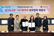 대구문학관과 대구도서관은 지난 1월 30일 독서문화 진흥과 지역문화 활성화를 위한 업무협약을 체결했다. 대구도서관에서 열린 이번 협약식에는 하청호 대구문학관 관장과 권현주 대구도서관 관장 외 각 기관의 실무자들이 참석하여, 두 기관의 상호협력 방안을 공유하며 지역 문학 및 문화예술의 가치 확산을 위한 활동을 공동으로 추진하는 데 뜻을 모았다. 양 기관은 이번 업무협약을 시작으로 앞으로 독서문화 진흥을 위한 사업 발굴 및 추진, 독서문화 프로그램 운영을 위한 전문 강사 및 인력 지원, 전시 및 문학 프로그램 운영 협업 활동을 함께 적극적으로 펼쳐 나갈 계획이다. 양 기관의 대표는 “지역에서 독서 및 문학향유의 중심에 선 두 기관 간의 이번 업무협약을 계기로 앞으로 양질의 창의적인 프로그램 개발을 통해 서로 간의 인적, 물적 교류가 활발하게 이루어져 지역의 독서문화를 선도해 갈 수 있기를 희망한다.”고 이번 업무협약에 대한 기대를 밝혔다. [뉴스출처 : 대구시]