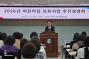 충주시는 13일 충주시청 중회의실에서 관내 어린이집 원장을 대상으로 ‘2026년 보육사업 추진 설명회’를 개최했다고 밝혔다. 설명회에서는 올해 보육사업 주요 변경 사항과 어린이집 지도·점검 사례를 공유하고 신규 사업을 안내하며 어린이집의 참여와 협조를 요청했다. 또한 어린이집 운영 과정에서 겪는 애로사항과 현장의 다양한 의견을 청취하는 시간을 갖고, 적극적인 소통을 이어갔다. 이와 함께 충주시육아종합지원센터에서 진행하는 다양한 보육 지원 프로그램도 소개됐다. 센터는 보육교직원을 위한 전문 교육과 상담, 현장 지원 프로그램, 각종 행사뿐만 아니라 부모를 위한 올바른 양육 교육과 가족 참여 프로그램 등도 제공해, 보육 전반에 걸친 지원과 현장 맞춤형 서비스를 강화하고 있다. 시 관계자는 “보육 현장에서 아이들을 위해 애쓰고 계신 어린이집 교직원 여러분께 감사드린다”며 “아이들이 안전하고 행복하게 성장할 수 있는 보육환경 조성을 위해 시에서도 지속적으로 노력하겠다”고 말했다.
