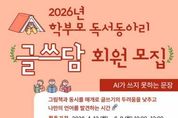 인천광역시교육청주안도서관은 학부모의 인문학적 소양을 함양하고 가정 내 독서문화를 확산하기 위하여, 오는 23일부터 학부모 독서동아리 ‘글쓰담’ 회원을 모집한다. 이번 프로그램에 참여하는 학부모들은 ‘AI가 쓰지 못하는 문장’이라는 주제로 그림책과 동시를 읽고 자신의 삶과 연계해 글과 그림으로 표현하는 시간을 갖는다. 프로그램 운영 기간은 4월 13일부터 6월 8일까지이며, 주안도서관 누리집에서 3월 23일 오전 10시부터 선착순으로 모집한다. 자세한 내용은 도서관 누리집을 확인하거나 어린이자료실로 문의하면 된다.