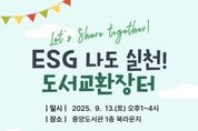 인천광역시교육청중앙도서관은 환경친화적 독서 문화 조성과 지역사회 나눔 실천을 위해 9월 13일 오후 1시부터 4시까지 중앙도서관 1층 북라운지에서 ‘ESG 실천 도서교환장터’를 개최한다. 시민들은 다 읽은 책을 가져와 다른 책과 교환할 수 있으며, 최근 5년 이내 발간된 개인 소장 도서만 1:1로 교환할 수 있다. 1인당 최대 3권까지 가능하다. 단, 파손 도서, 수험서, 교과서, 전문서적, 전집류 등은 교환 대상에서 제외된다. 같은 날 중앙도서관에서는 주말을 맞아 다양한 부대 프로그램도 마련된다. ‘도서관에서 만나는 우리 동네 국립극장’ 공연 콘텐츠와 ‘내 손에 쏙! 세계의 랜드마크’ 다문화 체험활동이 함께 진행돼, 가족 단위 방문객에게 풍성한 즐길 거리도 제공한다.